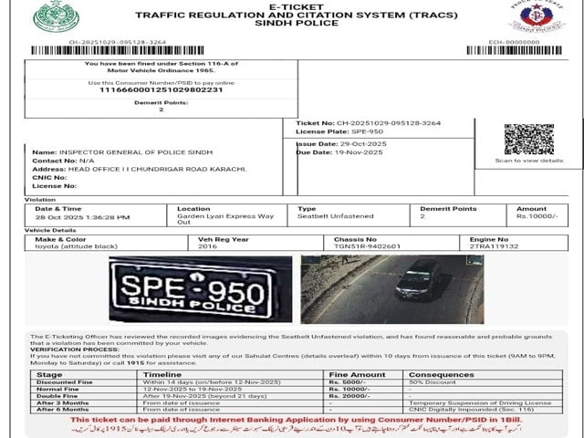 کراچی: شہر قائد میں حال ہی میں نافذ ہونے والے جدید فیس لیس ای ٹکٹنگ نظام نے ڈی آئی جی ٹریفک پیر محمد شاہ کی گاڑی کا بھی چالان جاری کر دیا۔ چالان لیاری ایکسپریس وے سے گارڈن انٹر چینج اترتے ہوئے ڈرائیور کی جانب سے سیٹ بیلٹ نہ باندھنے کی خلاف ورزی پر 10 ہزار روپے کا کاٹا گیا۔