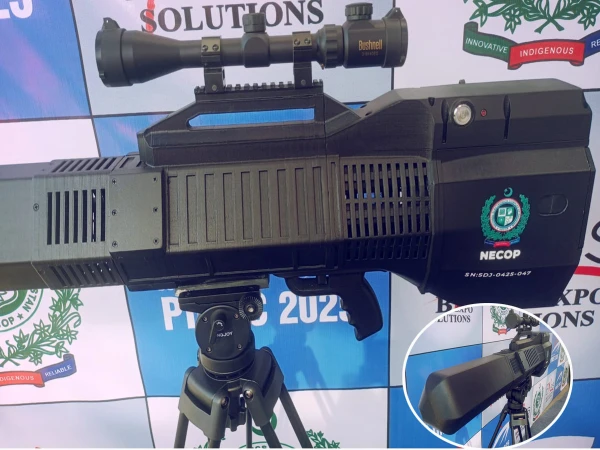 کراچی میں جاری پاکستان انٹرنیشنل میری ٹائم کانفرنس ایکسپو (پائمیک) میں پاکستانی ساختہ جدید ڈرون جیمر گن ’صفرا‘ لانچ کر دی گئی، جو ہزاروں فٹ بلندی پر اڑنے والے ڈرونز کو مفلوج کرکے زمین پر اتارنے کی صلاحیت رکھتی ہے۔