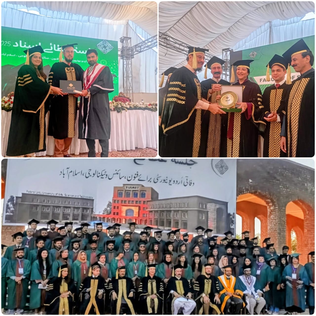 اسلام آباد : فیڈرل اردو یونیورسٹی اسلام آباد میں جلسہ ء عطائے اسناد بدھ کو منعقد ہوا۔ 2011 سے 2022 تک مختلف ڈیپارٹمنٹس سے فارغ التحصیل طلباء و طالبات کو ڈگریاں عطا کی گئیں۔ اعزازی نمبر لیتے ہوئے ڈیپارٹمنٹ ٹاپ کرنے والے گریجویشن، ایم فل اور پی ایچ ڈی کے سابق طلبہ کو میڈلز سے نوازا گیا۔ وزیر مملکت برائے تعلیم وجیہہ قمر نے کانوکیشن کی صدارت کی۔ ممبران قومی اسمبلی انجم عقیل، جمال رئیسانی اور فتح اللہ اعزازی مہمانان کی نشستوں پر براجمان تھے۔ وائس چانسلر ڈاکٹر ضابطہ خان شنواری نے ڈگری اور میڈلز لینے والے سٹوڈنٹس کو مبارکباد دی۔
