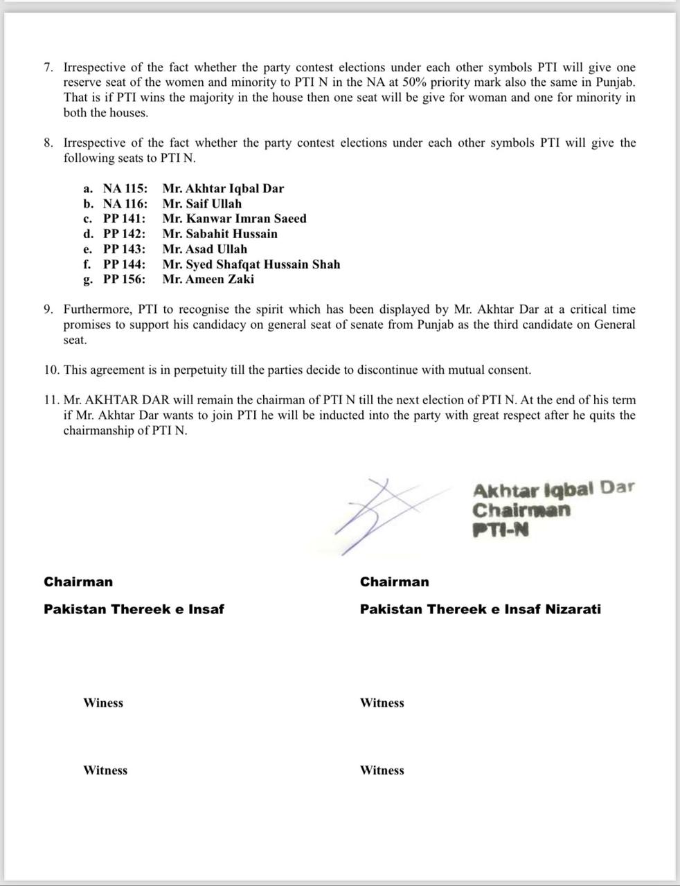 معاہدے کے تحت پی ٹی آئی اور پی ٹی آئی نظریاتی دونوں جماعتوں کے تمام اختیارات عمران خان کے پاس ہوں گے۔پی ٹی آئی اور تحریک انصاف نظریاتی کے درمیان ٹکٹوں کی تقسیم کا معاہدہ 30 دسمبر 2023 کو ہوا۔تحریک انصاف نظریاتی نے ٹکٹوں کے بدلے پی ٹی آئی سے دو قومی او پانچ صوبائی اسمبلیوں کے ٹکٹ لیے، تحریک انصاف نظریاتی نے ٹکٹوں کے بدلے پی ٹی آئی سے دو مخصوص نشستیں بھی لیں، معاہدے کے مطابق تحریک انصاف نے چیئرمین پی ٹی آئی نظریاتی کو سینیٹ میں بھی سپورٹ کرنا ہے، تحریک انصاف نے چیئرمین پی ٹی آئی نظریاتی اختر اقبال ڈار سے دستخط کے بعد معاہدہ اپنے پاس رکھ لیا،معاہدے میں طے پایا کہ پی ٹی آئی اور تحریک انصاف نظریاتی کے امیدوار ایک ہی نشان پر الیکشن لڑیں گے،پہلی ترجیح انتخابی نشان بلا ہوگا اگر بلا نہ ہوا تو تمام امیدوار بلے باز پر انتخاب لڑیں گے، پی ٹی آئی اور تحریک انصاف نظریاتی کے تمام فیصلوں کا اختیار بانی پی ٹی آئی کے پاس ہوگا،